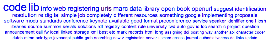 The keynote address, Critical collaborations: Programmers and catalogers? Really?, was given by Diane Hillman (Metadata Management). In it she advocated greater collaboration between the catalogers and coders. “Catalogers and coders do not talk with each other. Both groups get to the nitty-gritty before their is an understanding of the problem.” She said change needs to happen, and it should start within our own institutions by learning new skills and having more cross-departmental meetings. Like Wheeler, she had her own set of tensions: 1) “cool” services versus the existing online public access catalog, and 2) legacy data versus prospective data. She said both communities have things to learn from each other. For example, catalogers need to learn to use data that is not created by catalogers, and catalogers need not always look for leadership from “on high”. I asked what the coders needed to learn, but I wasn’t sure what the answer was. She strongly advocated RDA (Resource Description and Access), and said, “It is ready.” I believe she was looking to the people in the audience as people who could create demonstration projects to show to the wider community.